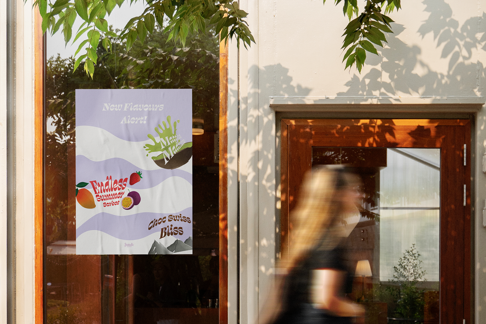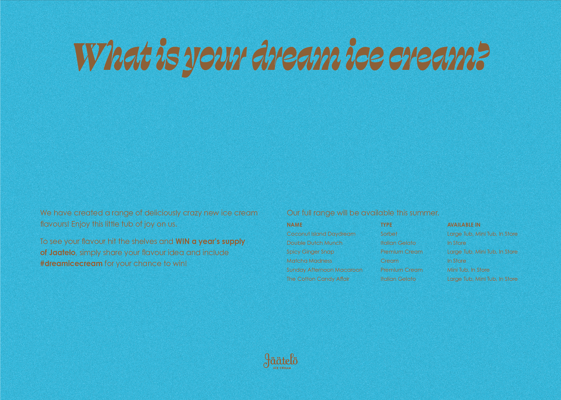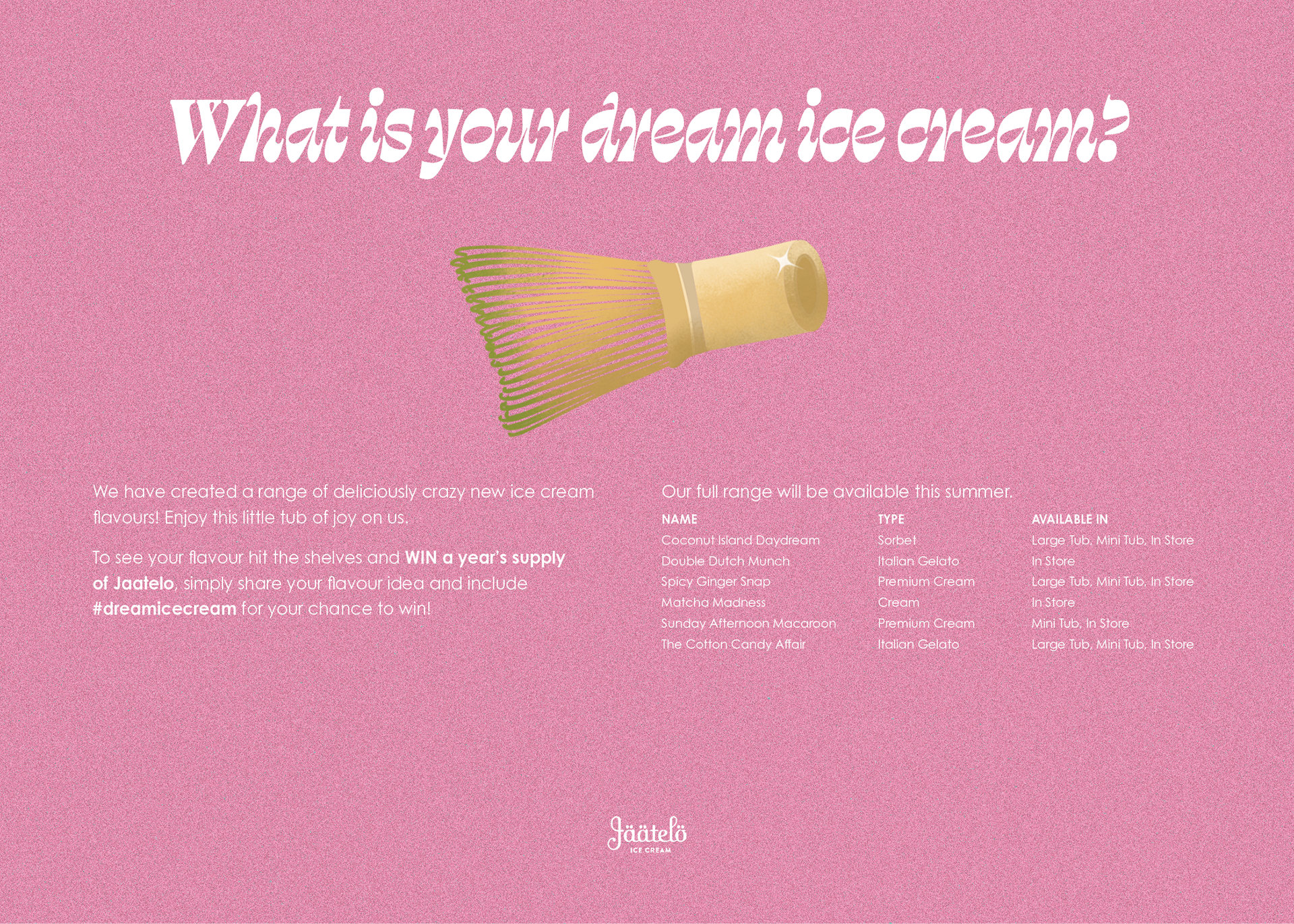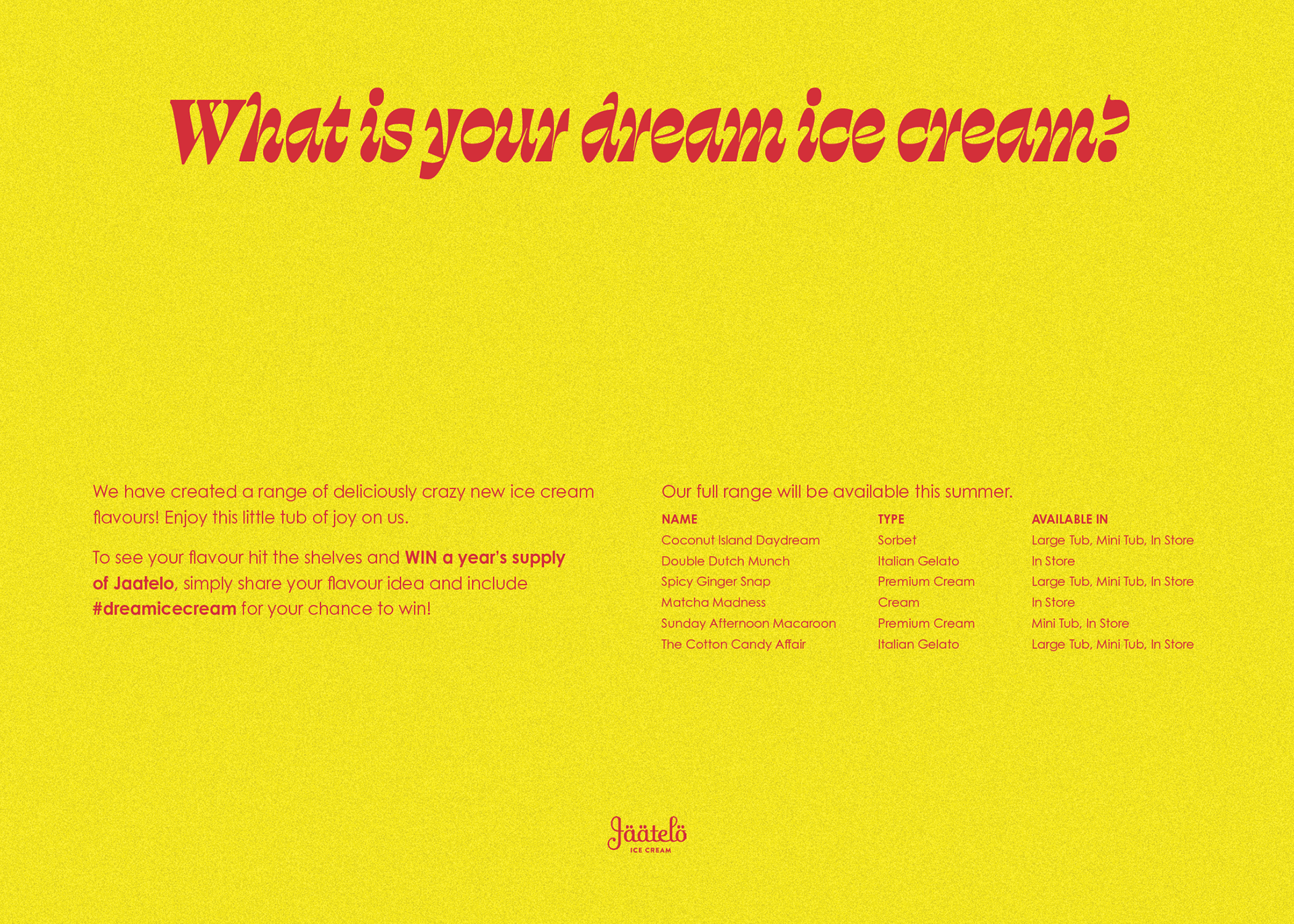 Creating a dynamic and lighthearted design that appeals to a wide audience for Jaatelo’s pre-launch campaign to test their range of flavours by giving out free mini-tubs of ice cream.